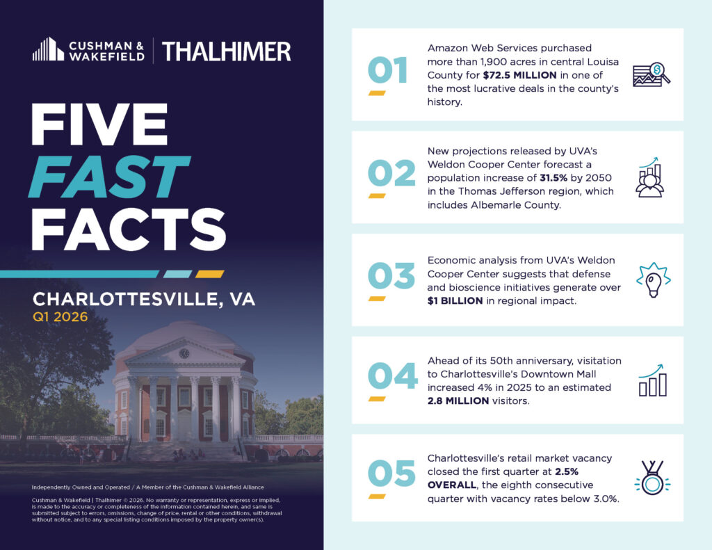 Read the top five facts affecting the Charlottesville commercial real estate market in the first quarter of 2026. Reports for all markets can be found here.