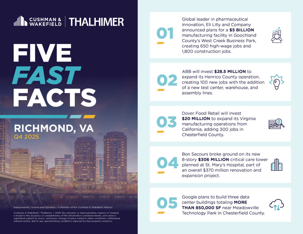 Read the top five facts affecting the Richmond commercial real estate market in the fourth quarter of 2025. Reports for all markets can be found here.