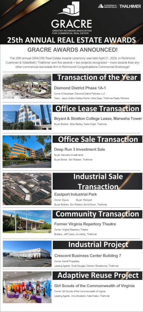 RICHMOND, VIRGINIA: The 25th annual GRACRE Real Estate Awards ceremony was held April 21, 2026, in Richmond. Cushman & Wakefield | Thalhimer won five awards + two projects recognized ~ more awards than any other commercial real estate firm in Richmond!